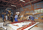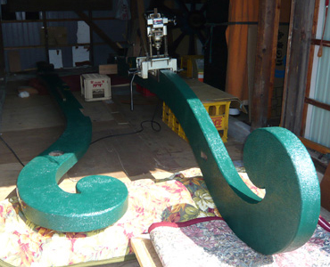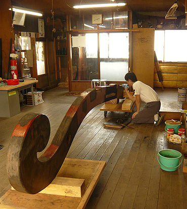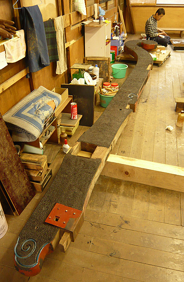 工房内に運び込まれ所狭しと、まるで大蛇のように横たわる曳き山の引き手。その形状から地元では「蕨手」わらびて、と呼ばれています。
