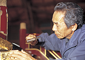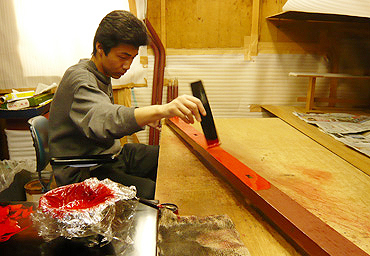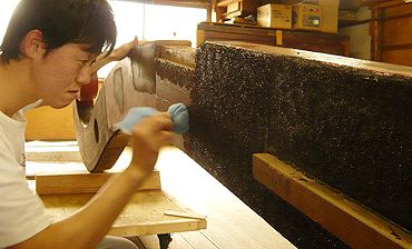 車輪の矢の部分に辛子色の漆塗り作業中。