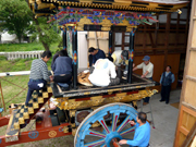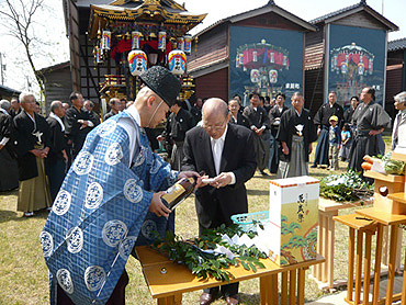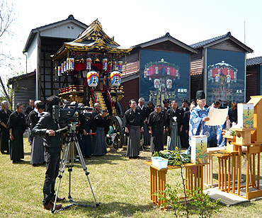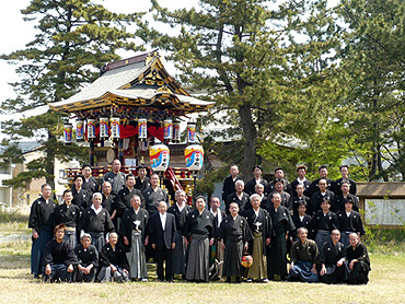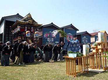 およそ11ヵ月間の大修復工程を終え、200年ぶりに蘇った曳き山を前に、完成を祝い、お祓いの神事を執り行う美川中町の役員の皆さん。