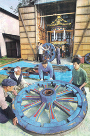 毎年5月白山市美川「おかえり祭り」に使われる「曳き山」が美川仏壇の職人技により、73年ぶりに大修復されることにりました。車輪は実に約200年前の建造以来初めての新調になります。