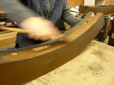 錆付け後、「錆たたき」をして細かい凹凸の模様を丹念に作り込んでいきます。この後、石で水研ぎを施し、中塗りへと進みます。