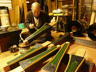 日本海をイメージする鮮烈な青緑色の漆に塗られた弾き手の最終仕上げ。