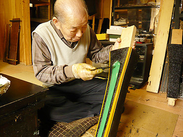 車輪の矢の部分に鮮やかな緑色の漆塗り作業中。
