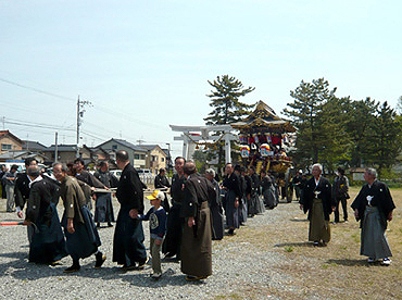 神事の後、地元の町民にお披露目のため美川駅前通りに向かって練り歩く美川中町の役員の皆さん