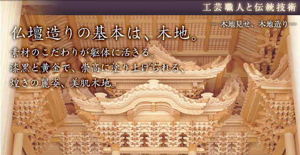江戸時代に現在の形に近いものが一般庶民の家庭に祀られたとされている仏壇には、日本の「木の文化」を語る要素が多く含まれているといえます。歴史を通じて日本人は、木材を非常に多くの用途に使用してきました。何百種類ともいわれる木材の中から形、大きさ、色、香り、耐朽性など、一本一本の樹木から取った木材でも個々に個性豊かな表情を魅せています。これも機械ではない自然が創りだした恵みだからこそ生まれたものなのです。