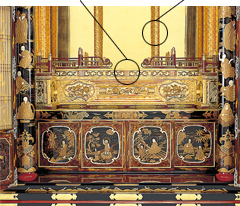 彼の仏壇造りに対するあく無き追求の思いはそれだけではとどまらず、奥州平泉、鎌倉、尾張、京の地場産業の見聞により、自らの仏壇造りの技法研究に情熱を燃やしたといわれています。その結果、平泉の螺鈿細工、鎌倉彫りを応用した堆黒、京の寺院の朱塗りなどの技法を巧みに採り入れ、極めて精緻ながら、堅牢、かつ荘厳、華麗な美川仏壇を完成させ、その名を後世に残しました。