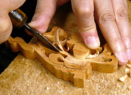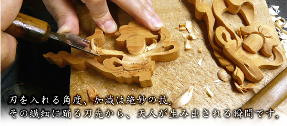 糸鋸で形取られた天人は、何種類もの彫刻刀を巧みに使いこなし、1枚の木の厚みを加味しながら、一気に、しかも丹念に彫り上げられていきます。