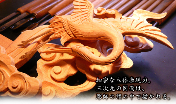 厚みのある1枚の板から一羽の鶴を精緻に立体的に彫り上げていきます、その立面図、側面図はすべて彫師の頭の中にあります。