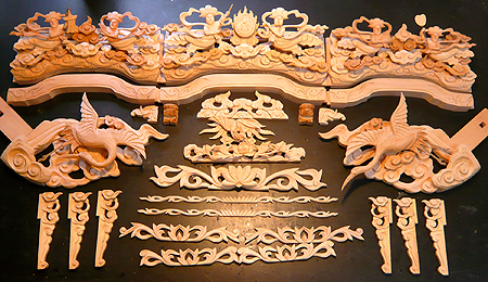 宮殿廻り、大柱、来迎柱、須弥壇に取り付けられる箔彫り用の彫刻部品一式は何百個にも及びます。(美川仏壇150代の例)