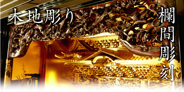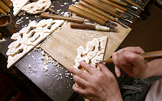 箔彫りは、宮殿廻り、大柱、来迎柱、須弥壇に飾り付けられる天人、雲、花鳥等の木の部品を彫刻する工程です。その後、漆が塗られ、金箔が押されることから「箔彫り」と呼ばれます。