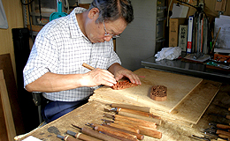 彫刻師松田一弥さんの工房内作業風景です。