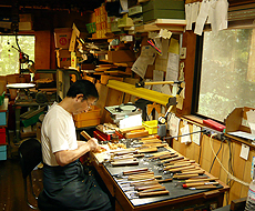 彫刻師北川義明さんの工房内作業風景です。作業台の上には所狭しとおよそ80本もの彫刻刀が並べられています。