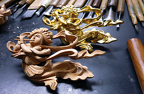 彫り上がった部品は、漆塗りの後、金箔が押され、完成します。