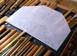 トレーシングペーパーに描かれた「雲」の下絵。驚くことに、お仏壇一本一本毎に、天人、雲、花鳥等の下絵がすべてオリジナルで描かれます。同じものは存在しません。