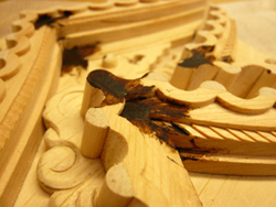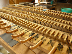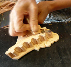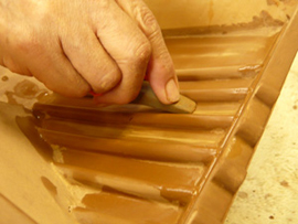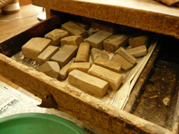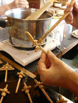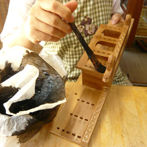 ニカワと砥の粉を練り混ぜ合わせた「泥地」(どろじ)を作り、手間と時間を掛け部品一個一個に4回塗り重ねます。