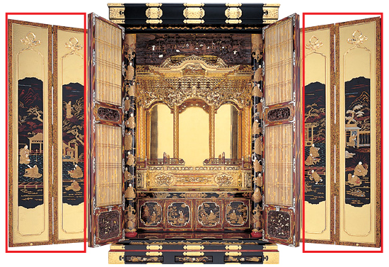 戸裏縁の框部分に、美川仏壇特異の絵柄模様が趣豊かに