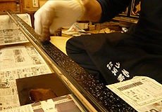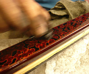 ↑炭研ぎ出しが進むにつれ、凸部分の下地の黒漆が